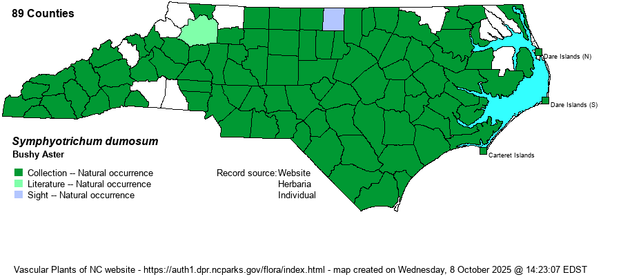 Abundance | Common to abundant across nearly all of the Piedmont and Coastal Plain; much less numerous in the northern Coastal Plain and northern Mountains. Bushy Aster, along with Frost Aster (S. pilosum), are our most widespread asters. | |