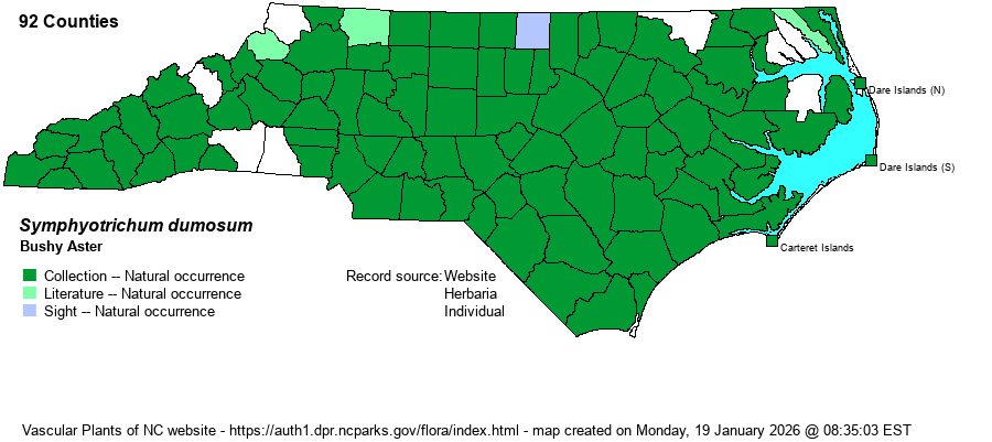 | Abundance | Common to abundant across nearly all of the Piedmont and Coastal Plain; much less numerous in the northern Coastal Plain and northern Mountains. Bushy Aster, along with Frost Aster (S. pilosum), are our most widespread asters. | |