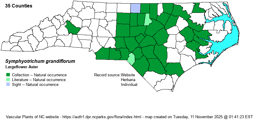 | Abundance | Frequent to locally common, but clearly declining (as of the 2020s), in the eastern Piedmont and western Coastal Plain, and fairly common in the Sandhills. Infrequent into the central Coastal Plain, east to Hertford and Beaufort counties. Rare to absent near the coast, and in the western half of the state. The State Rank is clearly S4 and not the very conservative S3. The spread of robust, yellow-flowered composites -- such as Bidens aristosa and several Verbesina species has greatly impacted this and other smaller native composites of woodland margins. | |