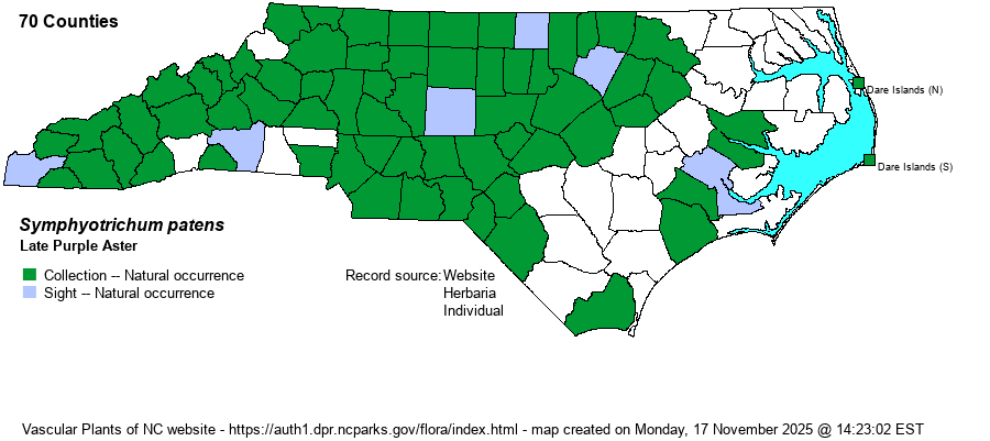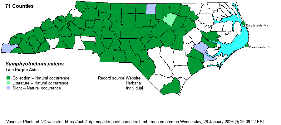 | Identification | Late Purple Aster grows 2-4 feet tall, and the stems are generally unbranched. Stem leaves are elliptical and strongly clasp the stem (auriculate). The inflorescence is open and features horizontally-spreading branches terminated by heads with pale violet, blue-violet, or bluish rays and yellow disks. Georgia Aster (S. georgianum) is colonial from horizontal rhizomes, middle and upper leaves are sessile but not strongly clasping the stem (vs. clasping with leaf tissue around most or all of the stem), has longer and more violet or purple-colored rays (vs. more bluish), and white disk florets (vs. yellow). From S. phlogifolium it differs in its thicker-textured leaves (vs. thin or soft in this latter species), and smaller upper stem leaves (maximum of 2 inches vs. 3 inches or more). Late Purple Aster is a familiar species except in the Coastal Plain, being a commonly seen bright violet-blue flowered aster of dry wooded margins and openings. | |