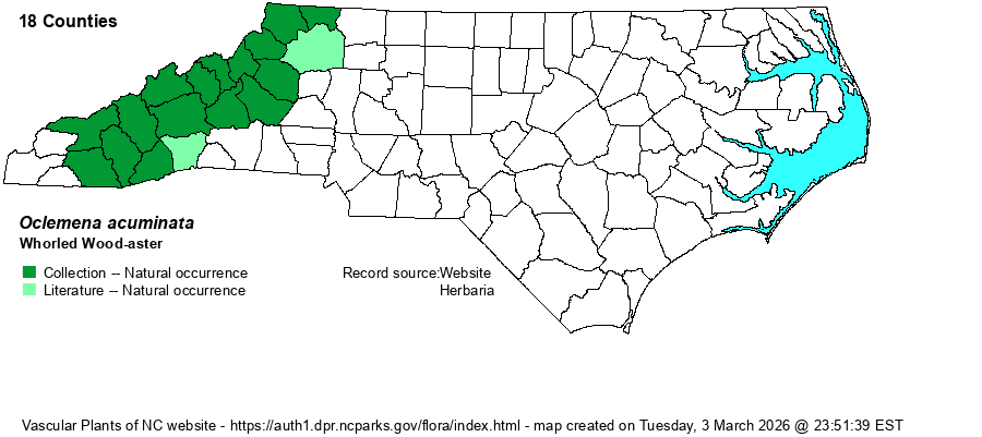 | Identification | Whorled Wood-aster has a distinctive look: the toothed and lanceolate leaves are rather crowded at mid-stem and appear to be whorled but in fact are alternate with very short internodes. The rather large heads are showy, with slender and often twisted or crooked white rays and yellow disks. The plant may grow to 2 feet tall, but often much shorter. Note that of the many genera that now contain NC's former Aster species, this is the only species moved into the genus Oclemena. | |