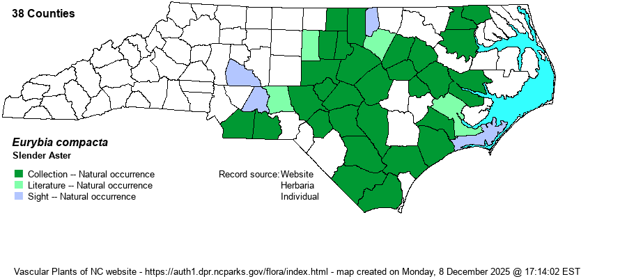 | Identification | The genus Eurybia has been split from Aster (now Symphyotrichum). Variation among species of each genus requires several steps in a key to split members of the two genera apart (see genus key in Weakley 2018).