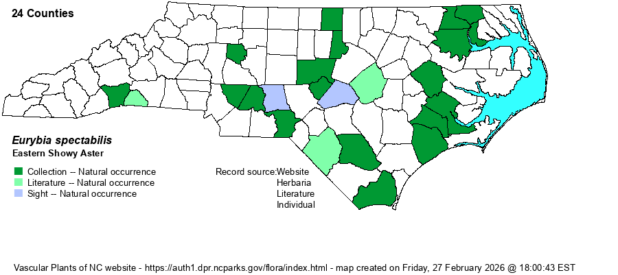 | Abundance | Some species with tighter ranges, such as E. mirabilis, can be reasonably numerous and be given a State Rank of S3. However, despite records for over 20 counties, very few populations of Eastern Showy Aster contain more than just a few plants, and many are old and presumed historical. This may be a species in moderate to strong decline. Despite a wide habitat selection, it is difficult to find, and it is considered Significantly Rare in NC; the State Rank of S1S2 indicates this rarity well. | |
