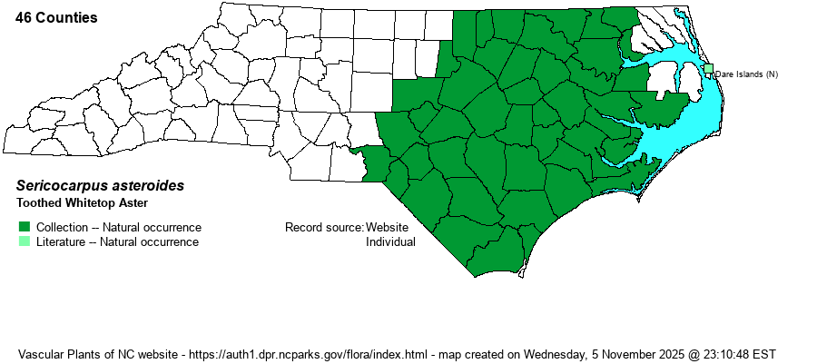 | Distribution | Nearly throughout the Coastal Plain, but rare to absent in the northeastern corner and on the Outer Banks (a record for Roanoke Island, Dare County). Ranges into the Piedmont to an undetermined extent. Note that S. asteroides was split by Nesom in 2021 into a revised S. asteroides and a new S. caespitosus. The latter is a more northerly species that occurs in the Mountains and Piedmont but not in the Coastal Plain. However, no herbarium splits out its S. asteroides collection. Thankfully, Nesom did provide a color county map of the two species, and the map below follows that.