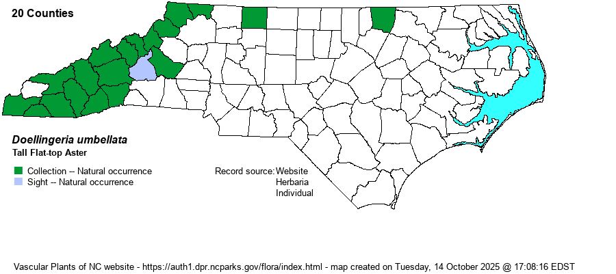 Identification | Stems usually grow 4-7 (-8) feet tall, with many lance-ovate leaves that are 6-15 cm long (vs. 4-11 cm long in D. sericocarpoides). Note the different habitats and montane range. As with our other two Doellingeria species, rays are white and disks yellow (turning brown). A plant in bloom with its numerous and large white flowers and flat-topped (or dome-topped) inflorescence is quite striking. | |