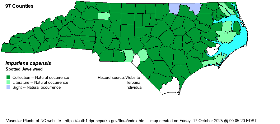 Other Common Name(s) | Spotted Touch-me-not, Orange Jewelweed, Orange Touch-me-not. These names and Spotted Jewelweed are used about as frequently as each other. Essentially, you can't go wrong with any of these four names! | |