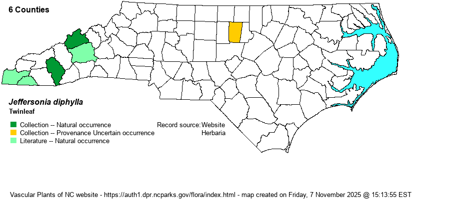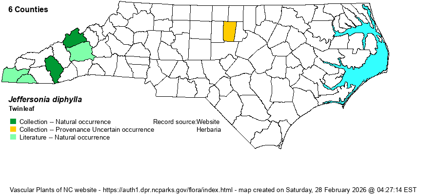 | Abundance | Very rare in the Mountains, known from just a handful of sites, despite a relative abundance of very rich forested slopes with high pH soils. It was first discovered in Jackson County in 1933, in Cullowhee; it was re-discovered in Cullowhee in 1992, though it is not clear if the two locations are the same. The Madison County site was discovered in 2007. The iNaturalist photos are in the last few years, certainly extant (if natural). This is a State Threatened species. | |