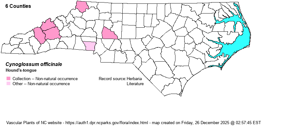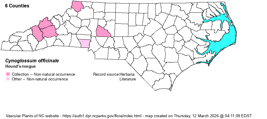 | Distribution | Mostly in the Mountains; also Rowan County. A specimen from Orange County has no data or image at SERNEC. Specimens from Polk and Transylvania counties are Andersonglossum virginianum, a native species.