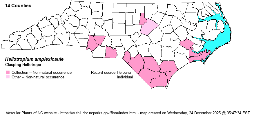 | Identification | Heliotropes formerly were included within the Borage (Boraginaceae) family, largely due to the coiled racemes of flowers. Clasping Heliotrope is a misnomer, as the leaves do not clasp the stem; rather, they are lance-shaped with a short basal taper to a sessile base. The rather small flowers on the coiled flowering stalks are lavender to blue-violet. | |