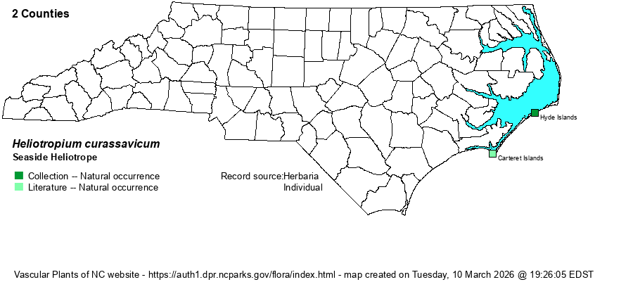 | Identification | This is a smooth, succulent herb, prostrate to ascending and reaching about 1 foot tall; where it occurs, it usually is found in dense stands. It has a few ascending stem leaves, elliptical and about 2 inches long. There are several curled flower stalks in helicoid cymes, at the ends of branches. The flowers are densely packed along the stalks, white or slightly tinged with light blue, and a spread of about 1/4-inch across, with 5 spreading petals. If seen in bloom, it would be very hard to overlook, as the curved white flower clusters are quite showy. The other three Heliotropium species in NC grow in waste places, or at least away from coastal shores and marshes. It is a shame that such a distinctive species is now of historical occurrence in the state, but it still should be searched for, as suitable habitat is still common. | |