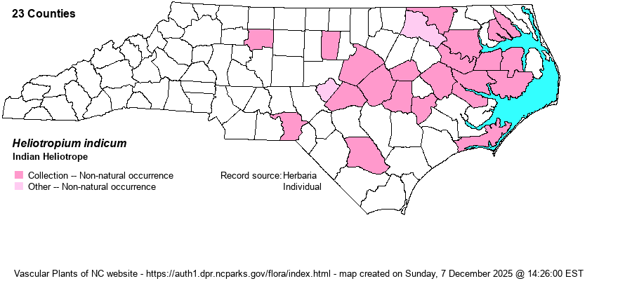 | Identification | Indian Heliotrope is readily identified by the single, slender, long raceme at the end of the stem or a branch -- often reaching 6 inches long. The flowers open from the base and slowly "work their way" to the tip, and thus when seen in bloom, usually only a small percentage of the raceme is in bloom. The flowers are light blue to white. | |
