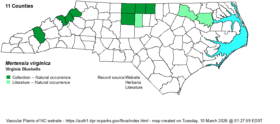 | Distribution | Scattered in the Mountains, the northern Piedmont, and along the Roanoke River in the northwestern Coastal Plain. There are numerous photos on iNaturalist from several additional counties, but as this species is at times planted in gardens and other sites, the editors do not feel comfortable that these represent natural locations; thus, these photo records are not incorporated into the map below.