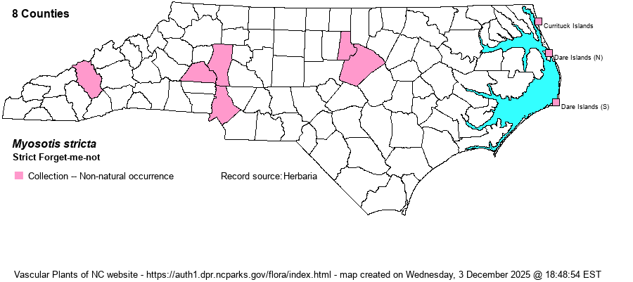 | Identification | This is our shortest forget-me-not and it has the smallest flowers. It is most similar to M. discolor, but the flowers grow essentially throughout the length of the stem (vs. just in the upper half). The petals are light blue to sky blue. | |
