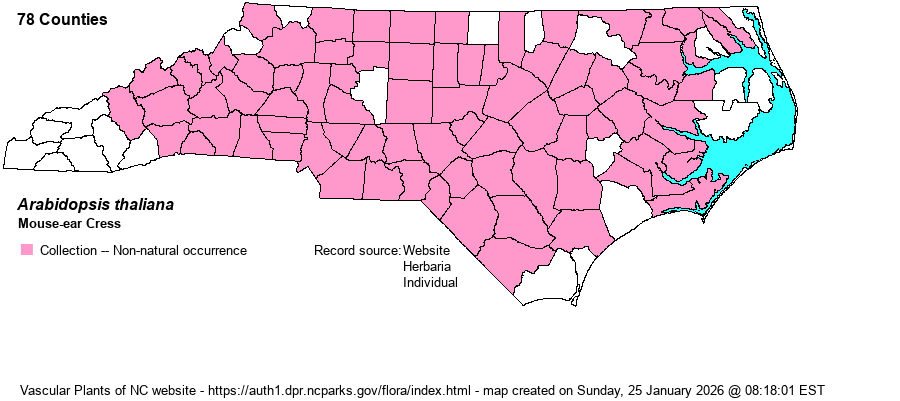 | Identification | Mouse-ear Cress is readily seen in early to mid-spring. Flowers appear almost as soon as the plants break through the ground and continue as the stem grows 6 inches to 1 foot tall. The basal leaves are obovate or elliptic, taper to the stem, and generally lie on the ground. The stem leaves are essentially sessile, narrowly elliptical to linear. The flowers are small and white; the pods linear, round in cross-section. | |