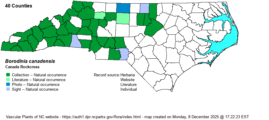 | Taxonomic Comments | This species was placed in the genus Arabis for most of the last century. It was generally moved to Boechera for a while in the 21st Century, but Weakley (2020) moved the Boechera species to Borodinia.