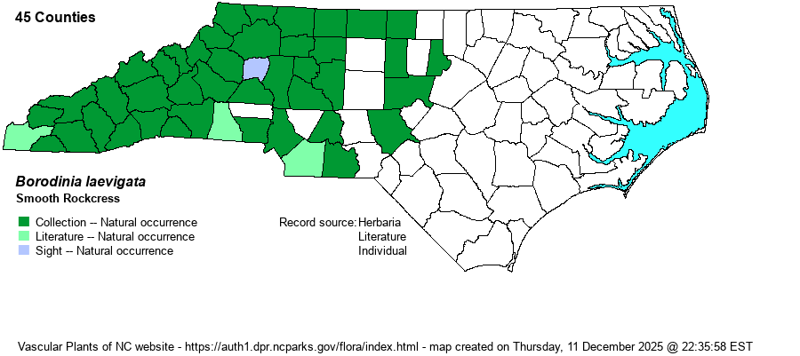 | Taxonomic Comments | The species was formerly named as Arabis laevigata. RAB (1968) and many other older references had the species divided at least into three varieties -- the nominate one, var. burkii, and var. missouriensis. These three are usually now listed as full species. Weakley (2020) moved this and other species from Boechera to Borodinia.