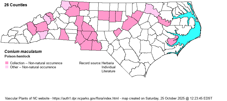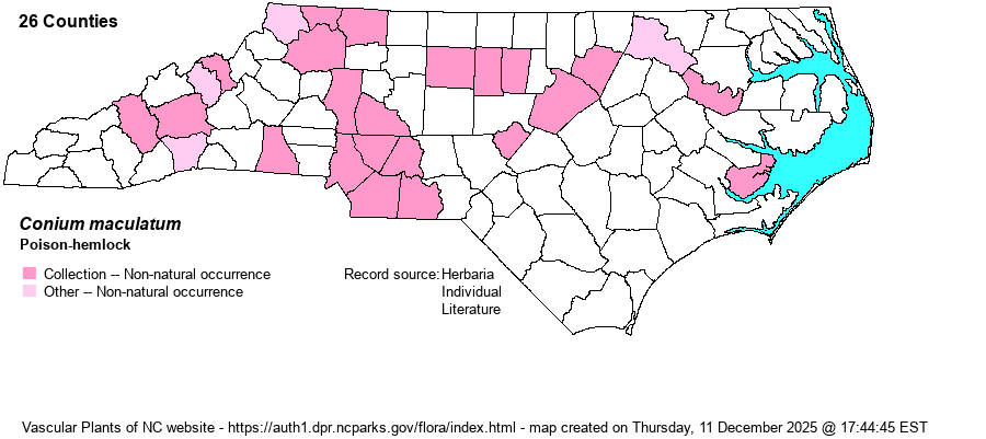 | Distribution | Mostly in the Piedmont, scattered in the Mountains, scarce in the Coastal Plain. First collected in 1949 in waste ground west of Greensboro, Guilford County. The Anson record is a photo of a robust plant at iNat website by Becky Dill.