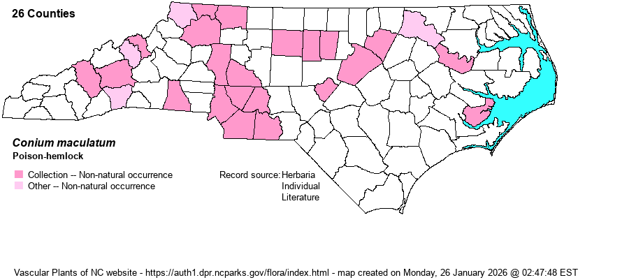 | Distribution | Mostly in the Piedmont, scattered in the Mountains, scarce in the Coastal Plain. First collected in 1949 in waste ground west of Greensboro, Guilford County.