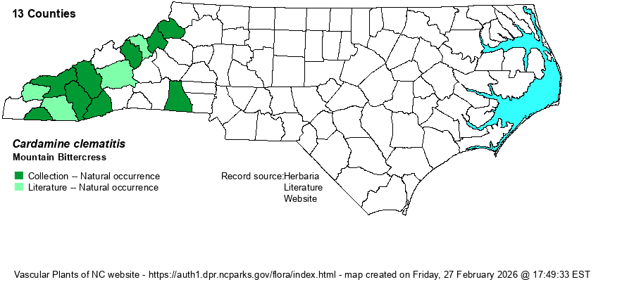 | Identification | Both this species and C. flagellifera are quite similar in overall appearance. Each is somewhat leaning to erect, to about 7-8 inches tall. Each has small basal leaves. The several alternate stem leaves are strongly pinnately divided into 3-5 segments, one terminal and 1-2 pairs of lateral leaflets; each leaflet is a bit oddly lobed and shaped, generally somewhat rounded and about 1-inch across and long at most. The flower cluster at the end of the stem is like others in the genus, with a few 4-petaled white flowers blooming at a single time, each one being about 1/2-inch across. These two species can easily be told from others by the odd stem leaves separated into 3-5 rounded leaflets. This species can be separated from C. flagellifera by: 1) the stem is smooth at the base, as opposed to pubescent at the base in the other; 2) the lower stem leaflets are green below, whereas the other has purple leaflets below; 3) the petioles are auriculate (eared) at the base, but not so in the other; 4) the leaves have mostly 3 leaflets, versus 3-5 leaflets in the other; and 5) the siliques (capsules) are 22-40 mm (about 1.3 inches on average) long, versus 10-25 mm (about 2/3-inch on average) for the other, based on characters in Weakley (2018). Thus, look for leaflets that are green below, and a smooth stem at the base, for this highland species; if fruit are present, this one has them more than 1-inch long. | |