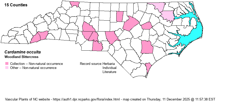 | Identification | Woodland Bittercress may be mistaken for the ubiquitous C. hirsuta, but the lower stems are pubescent (vs. glabrous in C. hirsuta) and the stems root at the nodes (vs. not and thus more erect in the latter). Robust, multi-stem plants may resemble the native C. pensylvanica, but the lower petioles are ciliate (vs. not ciliate in that species). | |
