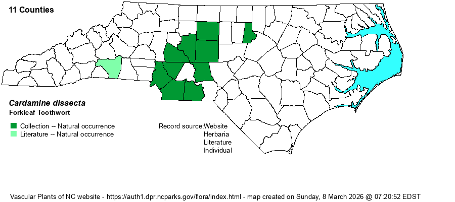 | Identification | This is the most slender of all of the Cardamine species, growing only to about 6-10 inches tall and with generally just 2 stem leaves, opposite each other. These are mainly three-parted, and deeply cut into very narrow, linear segments, often 5-6 or more such segments. Each segment can be 2-3 inches long and barely 1/8-inch wide. Similar highly dissected basal leaves can be present at flowering. The flower cluster at the top of the stem is essentially like those of C. angustata and C. concatenata -- a handful of white flowers in bloom at the same time, each with 4 white petals and a spread close to 2/3-inch across. It is most similar to C. concatenata, but its leaflets are more finger-like, usually three obvious segments with strongly serrated margins. | |