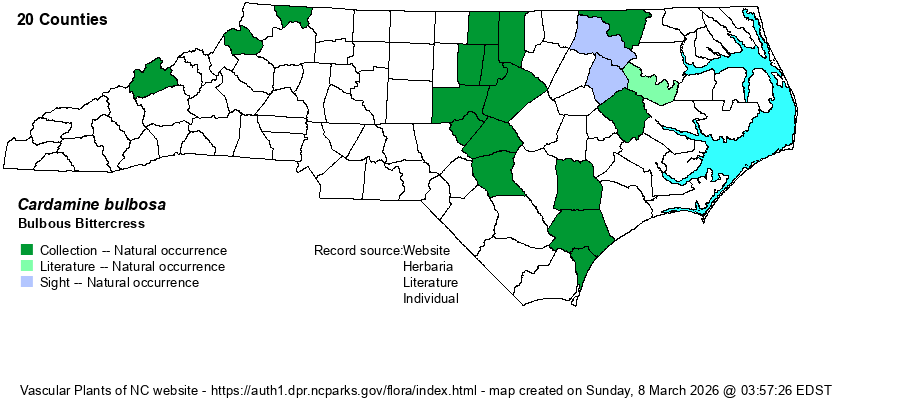 | Distribution | Present mainly in the northeastern Piedmont and the western and central Coastal Plain. There are a few records for the northern Mountains, but absent over most of the Mountains and Piedmont, the Sandhills region, and eastern parts of the Coastal Plain.