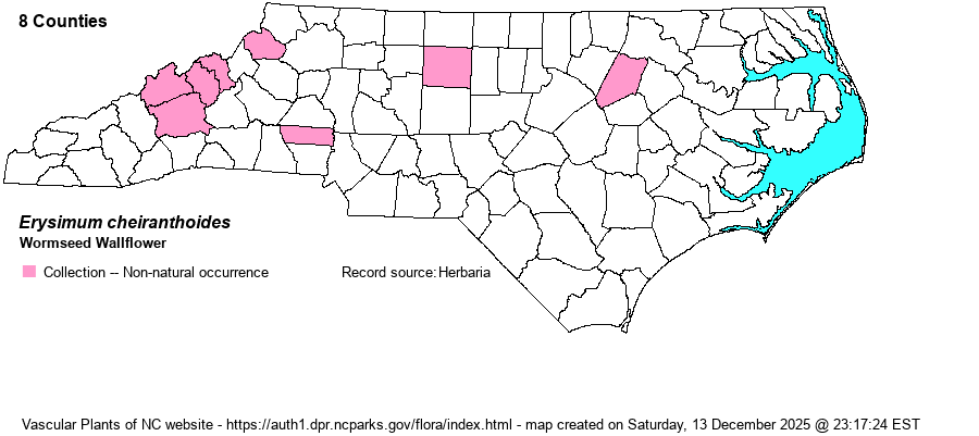 | Identification | Wormseed Mustard may grow from 6 inches to 3 feet tall; as often as not here in NC the plants are at the small end of the range. The leaves are narrowly lance-shaped, rapidly tapered to both ends, the margins neither toothed nor lobed. Yellow flowers grow in clusters terminally and from upper leaf axils; with age these clusters elongate greatly as fruits develop. The fruits are linear, and grow from short ascending stalks. | |