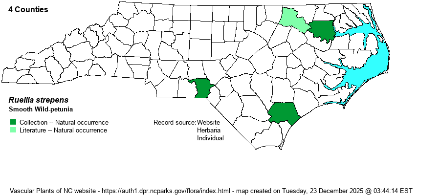 | Identification | This is a quite smooth and robust Ruellia, growing to 2-3 feet tall, much taller than the other NC species. It may have a few branches or be unbranched. The scattered opposite leaves usually have a short petiole, and the blades are fairly large, about 4 inches long and 1-1.5 inches wide, ovate to lanceolate, with entire margins. The flowers are essentially only from axils in the middle of the stem, usually singly at an axil and with a short stalk. The flowers are large, about 2 inches long and about 1-1.25 inches across the front, being lavender to light purple in color. No other Ruellia in NC approaches this one in size, and hardly any others even are over 1.5 feet tall. They are more pubescent, and the common R. caroliniensis has darker purple flowers from the upper leaf axils. To see this species, you likely will have to travel out of state, though it certainly must lurk in a few other rich soil places in the state. | |