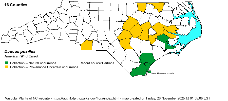 | Identification | This is a rather slender species that might be passed over as a smaller version of the abundant exotic Queen-Anne's-lace (D. carota). It grows to about 1.5-2 feet tall, usually unbranched. The scattered stem leaves -- about 4 inches long -- are generally ovate in shape, highly dissected twice, into lacy, fern-like segments, with the smallest segments barely 1/10-inch wide. The terminal umbel, and any side umbels, are flat-topped, with numerous rays, creating an umbel only about 2-2.5 inches across, noticeably smaller than that of D. carota, which has umbels about 4-5 inches across and often domed. Also, photos show large leaf-like bracts extending beyond the umbel. In the exotic species, the central flower in each umbel may be dark red to maroon, whereas as in the native species this flower and all others are white. (Some populations of D. carota lack such maroon central flowers, so absence of such flowers is not a useful character.) Also, the longest rays in an umbel in the exotic species are generally more than 3 cm long, whereas D. pusillus has rays shorter than 3 cm. No large bracts appear below the umbel. The most distinctive feature is the fruit -- this species has long barbs/spines, and thus the inflorescence at that season looks like it contains many small "cockleburs"; the abundant D. carota in fruit has the involucral bracts not obviously spiny. It is not clear if biologists 1) are searching but simply are no longer finding much of this species in recent decades, 2) are finding it in numbers but not collecting it anymore, or 3) are simply not paying attention to any Daucus for the reason that it is probably "just" the exotic species. | |