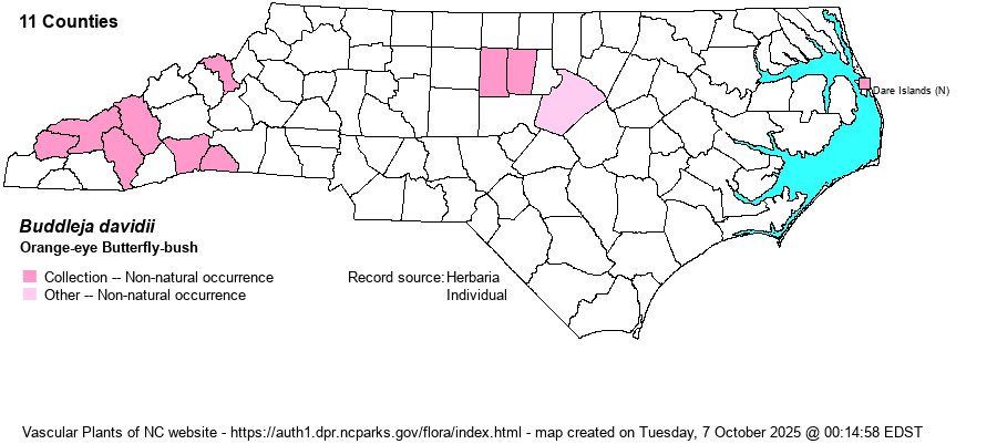 Distribution | Mostly in the southern Mountains; also a few counties in the lower Piedmont, and Outer Banks of Dare County. Probably has escaped in a handful of other counties, as this is a commonly planted species in yards and gardens.