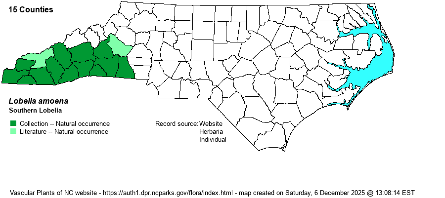 | Identification | This is one of several wetland species of Lobelia that are quite similar, and thus you must take care in the identification. These species are fairly tall, growing as an erect herb to 2 feet tall, rarely to 3 feet tall, usually unbranched. They have numerous alternate stem leaves. In this species, each leaf is lanceolate to elliptical, about 4 inches long and about 1.5 inches wide, with serrated margins. The top 3-5 inches of the stem is a raceme of numerous (20 or more) flowers, each of which is violet-blue to medium blue. The flower is about 3/4-inch long, tubular and with two lips, the lower with three lobes and extending far beyond the two small upper lobes. In this species, the leaves are thin and flexible, as opposed to thick and stiff in L. elongata, which does not overlap in range but is a Coastal Plain species. However, L. georgiana can occur in the same area with L. amoena; that species can be separated by usually thick leaves "with a parchmentlike texture" (Weakley 2018); and some calyx segments usually with small teeth (as opposed to all calyx segments entire and thus no teeth). The common L. puberula has a densely pubescent stem, whereas L. amoena has a smooth stem. In summary, this is a thin-leaved species with entire sepals. | |