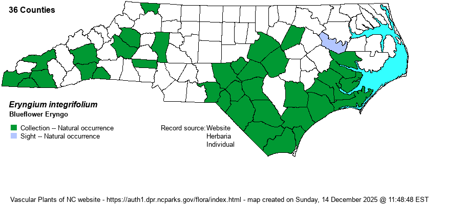 | Other Common Name(s) | Savanna Eryngo. More references use Blueflower Eryngo as a common name than do Savanna Eryngo, but as several other species have blue flowers, and as this a species of savannas, Savanna Eryngo is probably a better name to use, at least in NC. | |