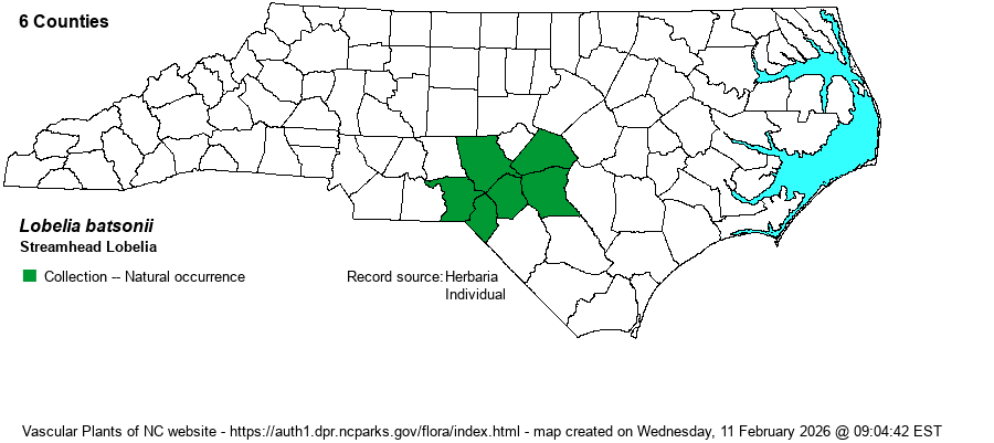 | Identification | This is one of several wetland species of Lobelia that are quite similar, and thus you must take care in the identification. These species are fairly tall, growing as an erect herb to 2 feet tall, rarely to 3 feet tall, usually unbranched. They have numerous alternate stem leaves. In this species, each leaf is very narrow, essentially linear, 3-4 inches long but usually about 1/5-inch wide, with serrated margins. The top 3-5 inches of the stem is a raceme of widely scattered flowers, relatively few, and secund (on one side of the stem), each of which is violet-blue to medium blue. The flower is about 2/3-3/4-inch long, tubular and with two lips, the lower with three lobes and extending far beyond the two small upper lobes. It occurs in the same area with several others in the Coastal Plain, though mostly with L. elongata; this species has very narrow leaves, always under 1.5 cm (3/5-inch) wide, whereas that species has much wider leaves. The common L. puberula has a densely pubescent stem, whereas this taxon has a smooth stem. This species has slender leaves as well, but the large flower lip is smooth on the base and inside, whereas L. glandulosa has the large lip densely pubescent on the base and also within the tube. Also, L. batsonii has a smaller flower, only 17-23 mm long, versus 19-27 mm long in L. glandulosa. However, they should be separable mainly by range, as the former is a Sandhill species, mainly in seepages and other moisture on slopes of pinelands, as opposed to L. glandulosa being a plant of more easterly range and flatter pinelands. In summary, this is a very narrow-leaved species with toothed sepals and relatively small flowers, strictly of the Sandhills region. Also, Sorrie (2011) mentions that L. elongata can be separated from L. glandulosa and L. batsonii by "the denser raceme, the much wider leaves, the longer calyx lobes, and its habitat". | |