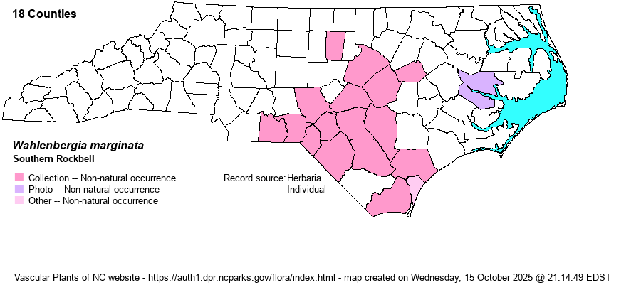 Distribution | Formerly confined to the Sandhills and southern Coastal Plain; plus a 2021 photo from Beaufort County on the outer Coastal Plain (Goose Creek SP). First collected in 1957 in Robeson County. It is spreading slowly, including inward; a specimen was collected in the Piedmont in Orange County (NCU) in 2023.