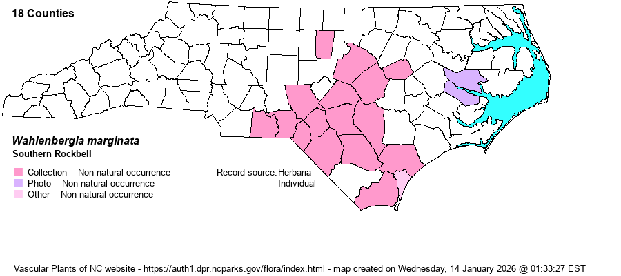 | Distribution | Formerly confined to the Sandhills and southern Coastal Plain; plus a 2021 photo from Beaufort County on the outer Coastal Plain (Goose Creek SP). First collected in 1957 in Robeson County. It is spreading slowly, including inward; a specimen was collected in the Piedmont in Orange County (NCU) in 2023.