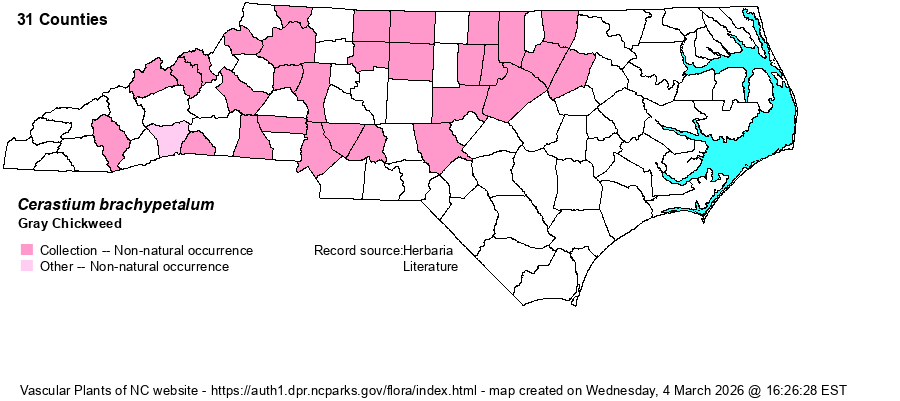 | Identification | Gray Chickweed is an annual, simple or with multiple stems from the base, shaggy with silvery hairs. The basal leaves are small and oblanceolate or spatulate, the stem leaves much smaller, sessile, bluntly elliptic. The flowers occur in open cymes, the petals 2-3 mm long and shorter than the sepals (4-5 mm long). The sepals have long, appressed, non-glandular hairs, contra several other alien and native Cerastium species. C. glomeratum also has such hairs, but its inflorescence is compact (vs. open). | |
