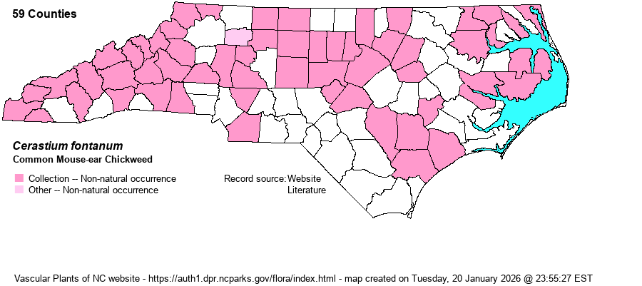 | Identification | Common Mouse-ear Chickweed is a matted perennial, which separates it from all of our alien Cerastium, and also from C. brachypodum and C. nutans. The petals are short (5-9 mm), about the same length or a bit longer than the sepals (5-7 mm). The inflorescence is an open cyme versus compact in C. glomeratum. | |
