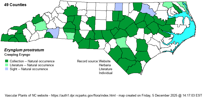 This is a Southern species, ranging from southern VA and southern MO south to central FL and eastern TX. The Digital Atlas of the Virginia Flora considers all records in that state to be of uncertain provenance, and Weakley (2018) states: "definitely native southward, perhaps only rather recently spread to the northern parts of our area". Though certainly some of the records from NC could fall into this category, where found in lawns, for example, most SERNEC specimens are rather old and certainly appear to represent native populations. | |