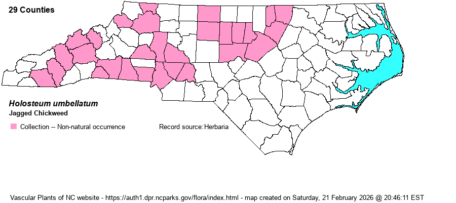 | Identification | This looks much like some species of Cerastium, but but it ranges up to a foot tall. The inflorescence is distinctive: an umbel of 3-10 very thin stalks, each terminated by a small flower. The sepals and the white petals are about the same length. In fruit, these long stalks often hang diagonally downward, giving a very distinctive look to the upper part of the plant. | |