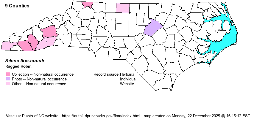 | Distribution | Collected in Alleghany County in 2007, Buncombe County in 1945, Jackson County in 2010, and Macon County in 1962. Photographs on iNaturalist that seem to be away from cultivation are from Rockingham, Cherokee, Henderson, and Transylvania counties. Photographed away from obvious cultivation in Wake County in 2024.