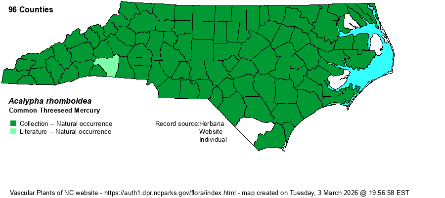 | Identification | Common Threeseed Mercury grows 2-3.5 feet tall, with long leafstalks and rather rhombic leaf blades. Aside from the more angular and wider leaves, it differs from Slender Threeseed Mercury (A. gracilens) by its longer leafstalks and longer teeth on the inflorescence involucres (leafy bracts that envelop the flowers). This is the familiar wide-leaved Acalypha of various habitats, looking a bit like a nettle species such as a member of Pilea, Boehmeria, Laportea, or Urtica in leaf shape and general appearance. | |