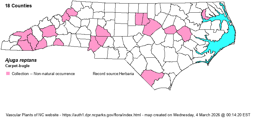 | Identification | Carpet-bugle is an old garden favorite. The plants are perennial from surficial stolons that have pairs of ovate leaves. A central, leafy stem grows erect with a terminal, dense inflorescence, altogether only 4-10 inches tall, with blue or violet flowers. Nothing else looks quite like it, though an inexperienced person might try to turn the very common Ground-ivy (Glechoma reptans) into this species, as they have similar flowers (but not inflorescences). | |