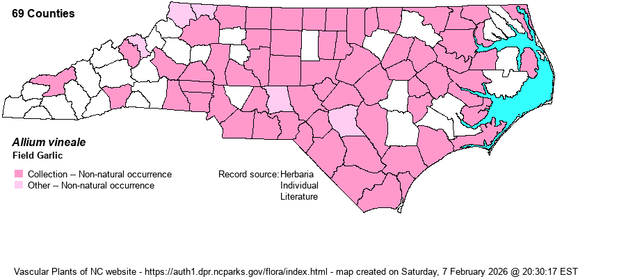 | Identification | Field Garlic is a familiar yard and roadside weed to biologists, but many people will simply walk past it, even when in bloom. It grows from a relatively narrow, white, elongate bulb; sometimes these are clustered. The leaves and flowering stems -- exuding an unpleasant "oniony" odor to many if not most people -- are a dark grayish green and rounded in cross-section (vs. reasonably flat or channeled in A. canadense). The flowers occur in a hemispherical or rotund head, at least some flowers replaced by dark red-purple bulblets. The few flowers are lavender-purple in color, usually staying somewhat closed (and not widely-spread into a 6-pointed star-shape as in A. canadense). | |