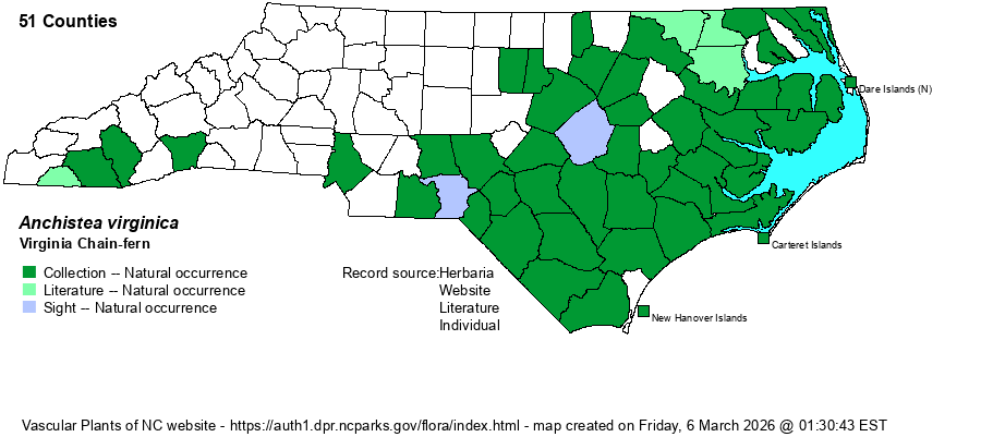 | Habitat | This is one of the more frequently seen ferns of strongly acidic wet soils in the Coastal Plain. It grows in peaty soils such as pocosins, blackwater bottomlands and swamps, blackwater streamheads, margins of Carolina bays, and other similar damp to wet sites in organic soils (mostly wooded and usually with sphagnum moss). | |