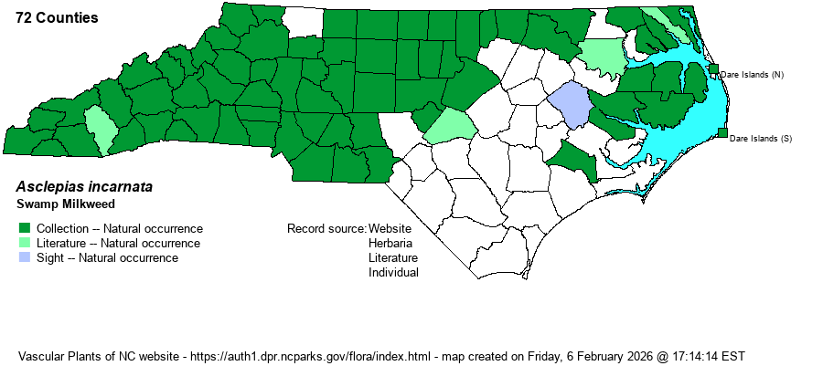 | Habitat | This is the primary milkweed species found in freshwater marshes in NC. It is normally found in full sun in wetlands, favoring marshes, but it also occurs in mountain bogs, very wet meadows, and openings in swamps and wet spots in bottomlands. The common name is a misnomer -- it is a marsh species, not a swamp species! | |