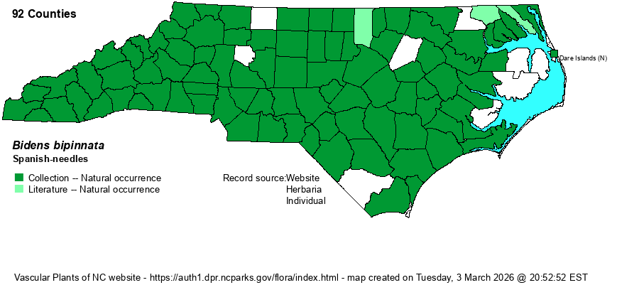 | Identification | Spanish-needles grows to 3-4 feet tall and is readily identified by its black, elongate, pronged fruits, 7-15 mm long. As in other beggarticks (Bidens spp.) the fruits are awned, in this case with 3-4 awns (vs. 2 in most of our species). Also unusual are the short (or absent) ray florets (vs. prominent in most our species). Thus, the flowers may appear to lack rays. The leaves are triangular in shape, with many divided segments as in most other Bidens. Most people are familiar with this weedy species by getting the numerous "barbs" stuck into their pants when brushing up against the plants. | |