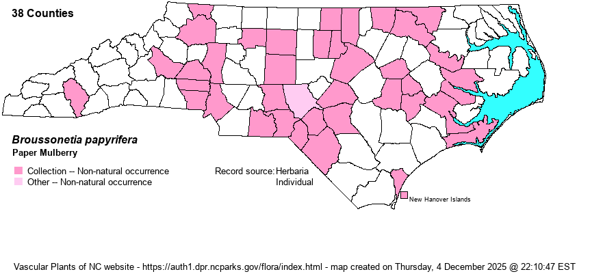 | Identification | Paper Mulberry is a small tree potentially to 50 feet high, but in NC probably just half that. Leaves look quite like Morus, broadly ovate in outline and with a drip-tip, some with no lobing, some with one "thumb", some with 2 "thumbs." Leaves are densely gray-pubescent beneath, unlike Morus. | |