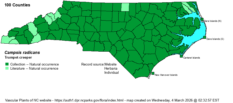 | Identification | This is a very familiar vine to most people, and it is easily identified over most of the year. It is a deciduous, high-climbing woody vine, climbing the highest trees by use of aerial roots on the trunks (similar to the growth form of Poison-ivy [Toxicodendron radicans]). The very large leaves are divided into 9 or 11 large leaflets, each leaflet being serrate margined and somewhat elliptic to ovate, about 2 inches long. If you cannot identify the vine by its large and divided leaves, the very long and showy orange-red trumpet flowers are certainly unmistakable. By fall, the long and cylindrical woody capsules, reaching 6 inches long, are easily seen, dangling from the vines. As with many or most vine species, the flowers do not appear until or unless the vines have climbed well off the ground, and particularly so where the vines are in full or partial sun. In winter, the pale tan-colored and shreddy bark is quite different from other high-climbing woody vines (Bignonia, Berchemia, Vitis) which have dark brown or gray-brown bark. Finally, Trumpet-creeper vines are striated lengthwise with grooves. | |