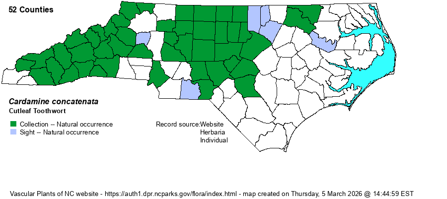 | Identification | This species is rather similar to C. angustata, in that it grows to about 9-12 inches tall, and occurs in extensive stands. Unlike that species and C. diphylla, this species has no basal leaves (at least during flowering and fruiting), and it has about 3 stem leaves, each one strongly ternately-divided into 3 finger-like segments, quite serrated, and about 2-3 inches long. Topping the stem is the flower cluster, with a handful in bloom at a time, each with 4 white petals and a spread of about 2/3-inch across or long. This is a very familiar spring wildflower in the lower slopes in the mountains, and at least locally so in most of the Piedmont. In this latter province, it is a good marker species of Basic Mesic Forests. Note that C. dissecta also grows in Basic Mesic Forests in the Piedmont; it has highly dissected leaflets that have linear to filiform segments, as opposed to finger-like segments with strong serrations. | |