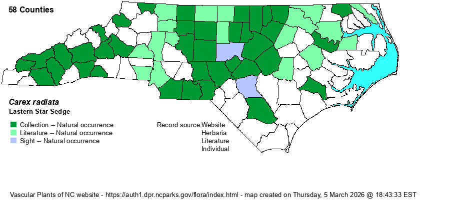 | Identification | Eastern Star Sedge is closely related to C. rosea and C. appalachica. It differs from them by its usually slightly coiled stigmas, seen even when in fruit (vs. usually tightly coiled). From C. socialis, told by shorter achenes (1.5-2.0 mm vs. 1.8-2.3 mm in C. socialis) and short rhizomes (vs. very elongate). | |